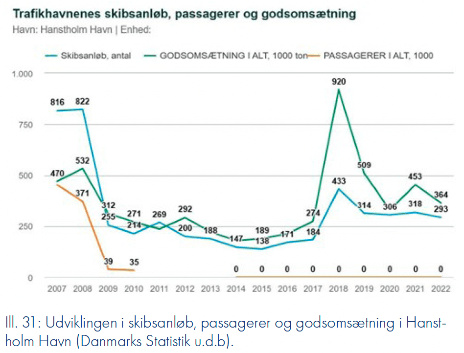 Havnebyen Hanstholm beskrives af Thisted Kommune som ’Regionens vækstmotor’, hvor havnen spiller en central rolle i byens identitet. Hanstholm Havn er kommunens største enkeltstående erhvervspotentiale med national betydning (Thisted Kommune 2021, s. 287, 290). Selvom Hanstholm Havn er Danmarks yngste havn, indviet i 1967, er den i dag Danmarks største konsumfiskerihavn og en af Europas vigtigste konsumfiskerihavne. Hanstholm Havn er geografisk placeret i nærheden af Nordsøens bedste fiskepladser, og Danmarks største fiskeauktion findes da også i Hanstholm. Havnen har fiskeri, transport, service, energi og akvakultur som sine største forretningsområder. I den forbindelse er både Hanstholm Havn og Thisted Kommune aktive inden for udvikling af bølgeenergi i Danmark som medstiftere af DanWEC (Danish Wave Energy Center) (Thisted Kommune 2021). Havnen er derfor et naturligt knudepunkt for både Hanstholm by og erhvervslivet i Thy og Nordjylland generelt (Hanstholm Havn u.d.b). Udover havnens erhvervsmæssige betydning er havet også af stor betydning for byen, da der er flere turistattraktioner knyttet til det, såsom surfing og lystfiskeri.