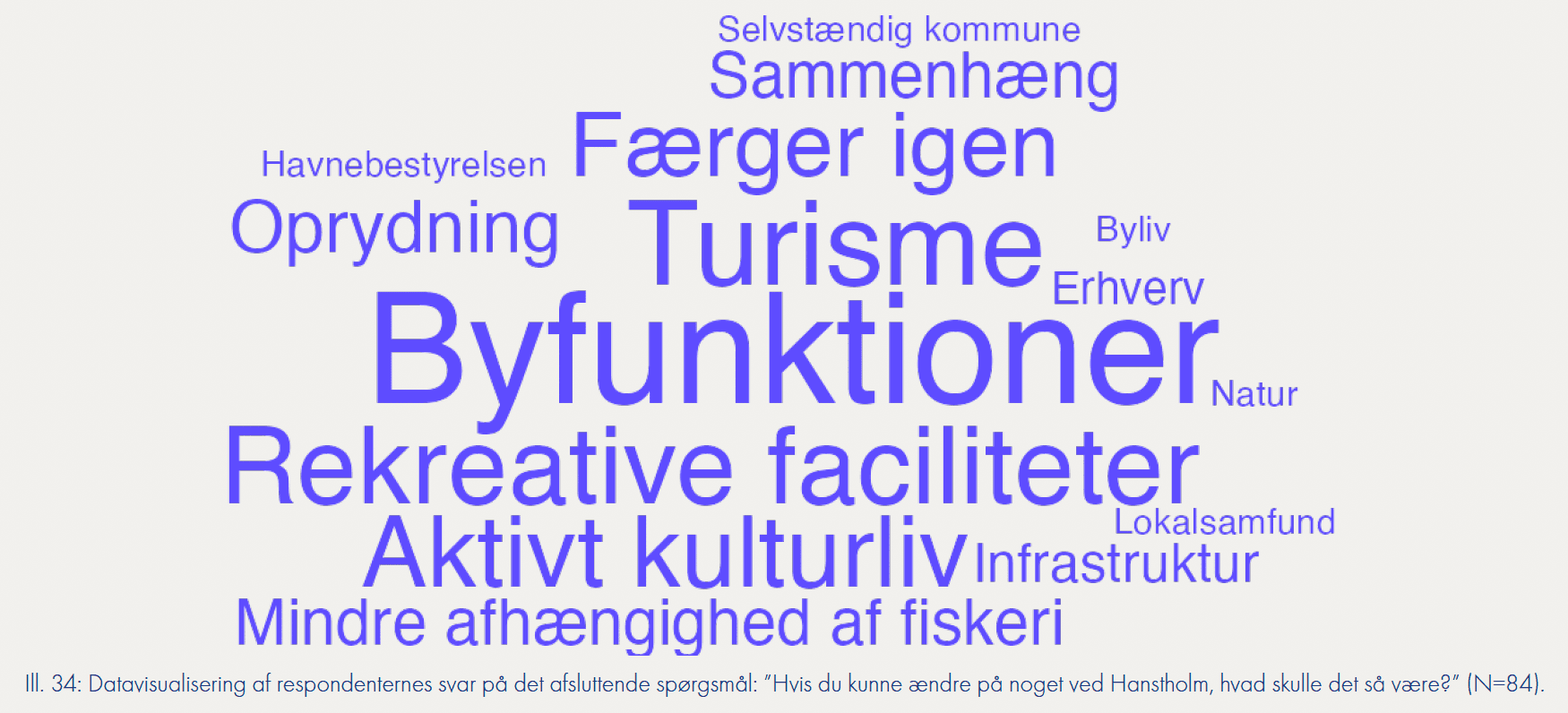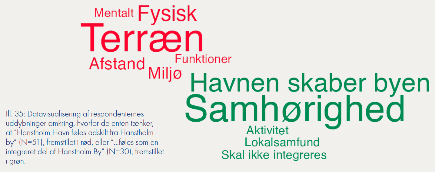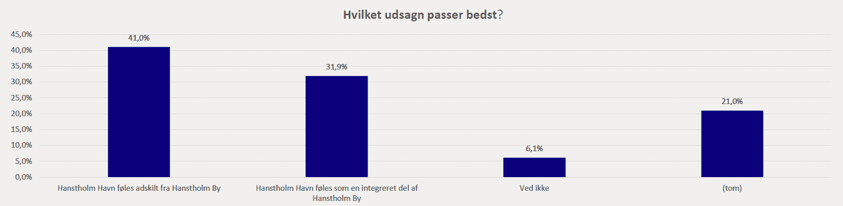 Mange respondenter udtrykker et ønske om forbedringer i byens fysiske miljø og flere aktiviteter, som kan gøre Hanstholm mere attraktiv for både beboere og besøgende. Der er specielt fokus på at fremme turismen og forbedre byens visuelle udtryk ved at vedligeholde og forskønne bygninger og offentlige rum. Befolkningsundersøgelsen peger sammenfattende på en by med stærke lokale værdier, men også med udfordringer relateret til udvikling og sammenhæng mellem by og havn. Der er en klar værdsættelse af naturen og det lokale fællesskab, men der er også et behov for byfornyelse og bedre integration af havnen som en central del af bylivet.