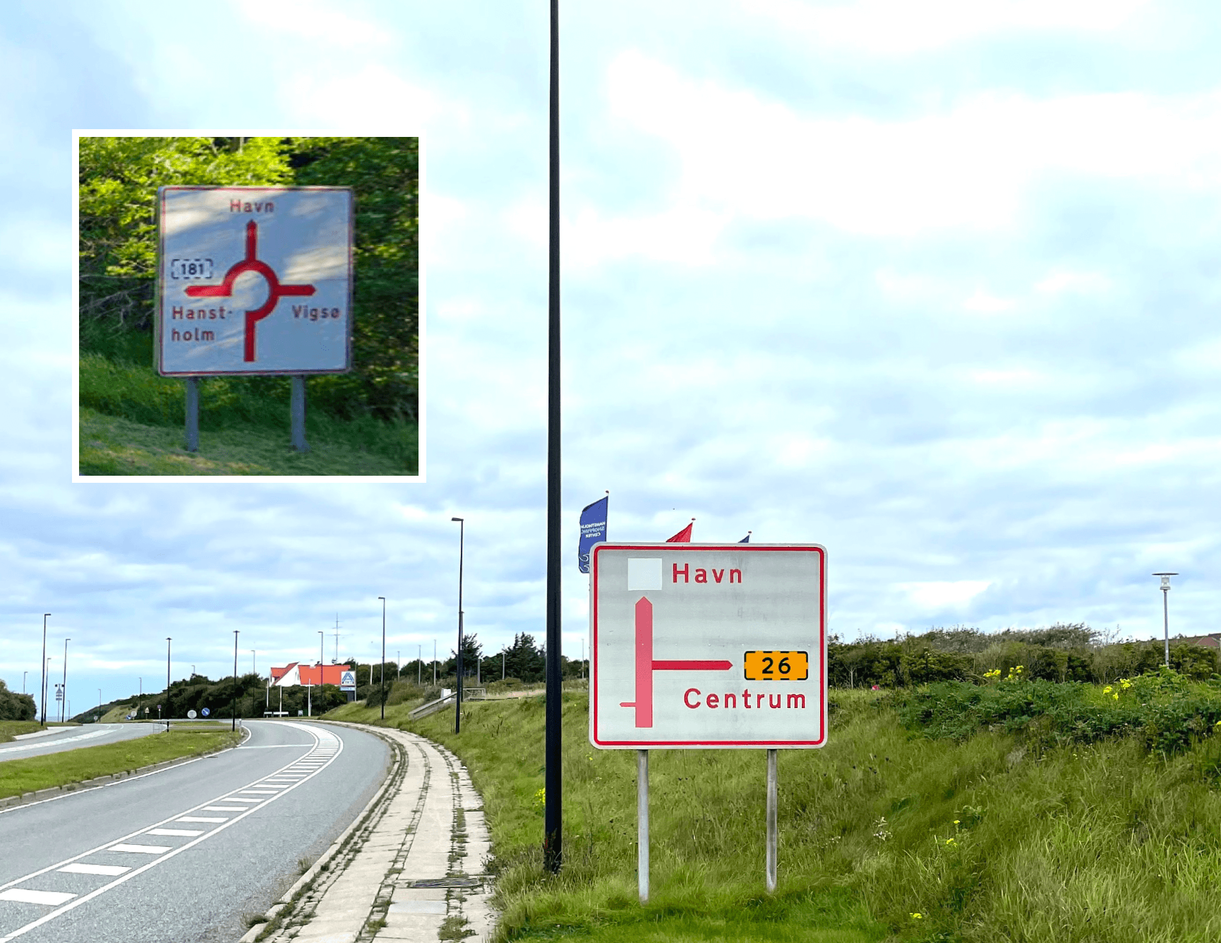 Ved ankomst til Hanstholm ad Kystvejen skal der drejes fra, for at komme til byens, mens vejen fortsætter direkte til havnen. Det samme er tilfældet i rundkørslen fra Thistedvej (lille foto).
