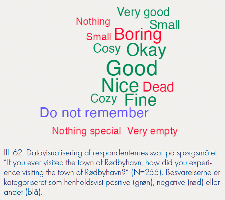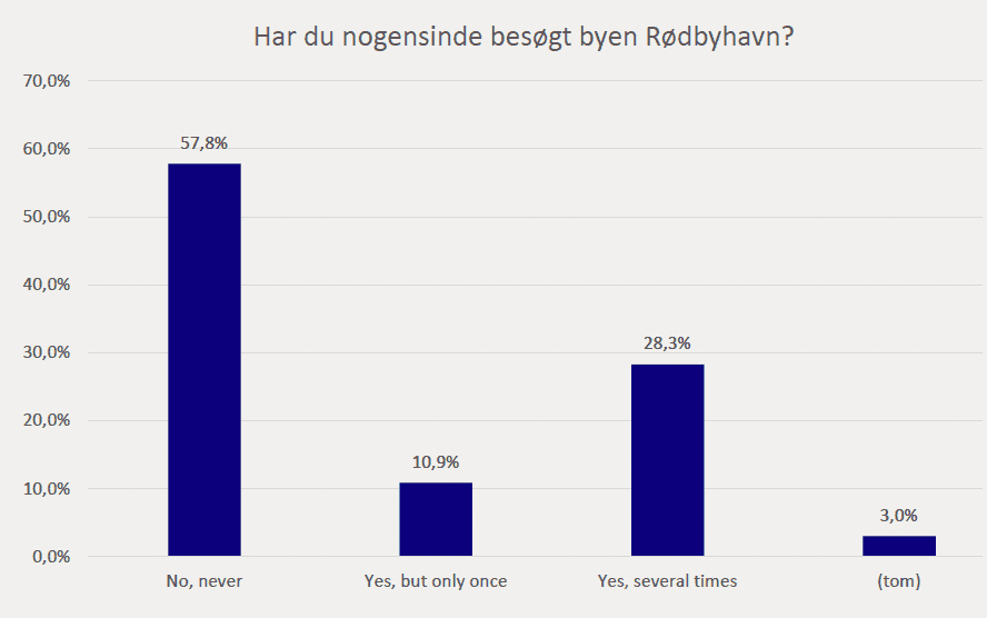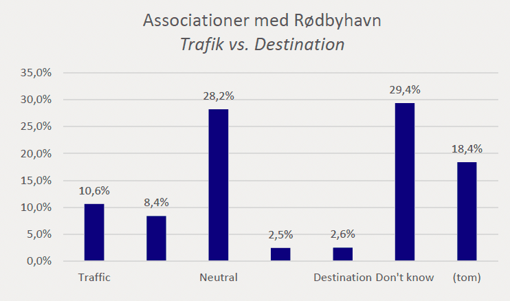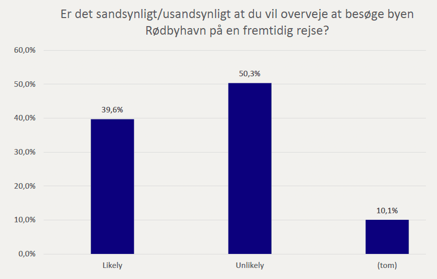 Blandt de rejsende, der har besøgt Rødbyhavn by, er der en blandet opfattelse af stedet. Omkring 58% af de rejsende, der har besøgt byen, beskriver oplevelsen som positiv, hvor de bemærker byen som rolig og lille. Dog er der også en betydelig andel, omkring 21%, der finder byen kedelig og uden særlige aktiviteter, og nogle beskriver den endda som en ”spøgelsesby”. Undersøgelsen viser således, at næsten halvdelen af de rejsende finder det usandsynligt, at de vil besøge Rødbyhavn i fremtiden. Dog angiver 40% af de rejsende, at de sandsynligvis ville overveje et besøg, især hvis de har været i byen før. Dette tyder på, at byens anseelse kan stige blandt dem, der tidligere har oplevet den.