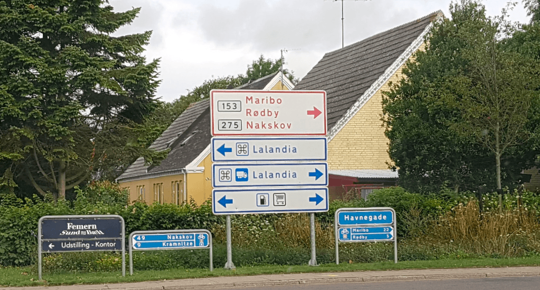 Der er meget skiltning ved vejene, men der mangler anvisninger mod centrum, bl.a. når man ankommer til Rødbyhavn ad motorvejen eller som her forenden af Vestre Allé. Ud fra disse skilte får man indtrykket af at Lalandia og Femern A/S Exhibition Centre er det, der er værd at besøge i byen. Derudover skiltes der mod andre byer. Der skiltes dog mod Havnegade, men som turist og udefrakommende ved man ikke, at Havnegade er det centrale butiks- og caféstrøg. Der kan derfor med fordel skiltes mere informativt mod bymidten.