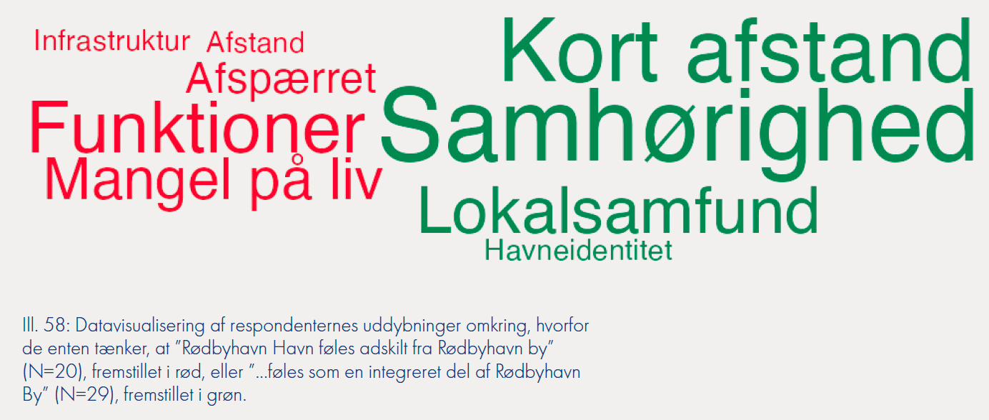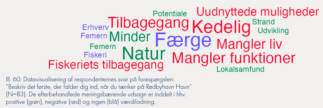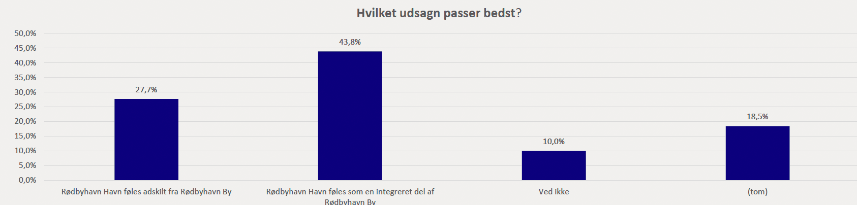 Over halvdelen af de lokale beboere som deltog i undersøgelsen, ser Rødbyhavn Havn som et sted i udvikling, mens en mindre andel mener, at havnen er i stilstand eller tilbagegang. Der er dog en generel opfattelse af, at havnen har potentiale til at blive et mere integreret og levende område af byen. En betydelig andel af respondenterne føler dog, at havnen er adskilt fra Rødbyhavn by, både fysisk og funktionelt. Der er en oplevelse af, at havnen ikke bidrager tilstrækkeligt til bylivet, hvilket skaber en vis afstand mellem de to områder.