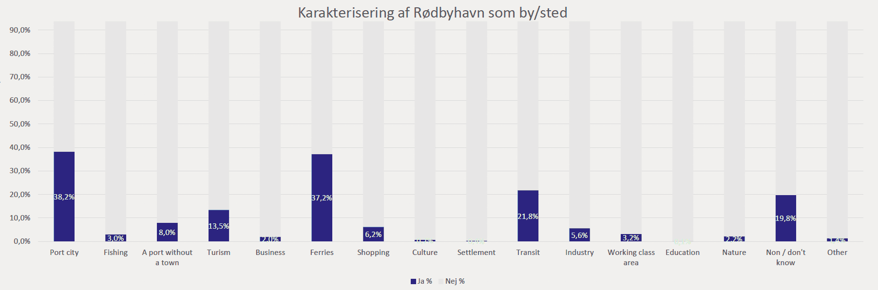 Næsten halvdelen af de adspurgte fremhæver naturen som en af de vigtigste kvaliteter ved Rødbyhavn. Byens nærhed til naturlige omgivelser, såsom kysten og de åbne landskaber, værdsættes højt af de lokale. Mange deltagere peger på fællesskabet, sammenholdet og det nære miljø i Rødbyhavn som noget særligt positivt. De værdsætter, at de har familie og venner tæt på, og at byen tilbyder en tryg og tæt lokal atmosfære. Flere respondenter nævner, at de ser et stort potentiale for byens fremtidige udvikling, især i lyset af den kommende Femern-forbindelse. Der er håb om, at denne forbindelse kan skabe nye muligheder for økonomisk vækst og forbedre byens infrastruktur.